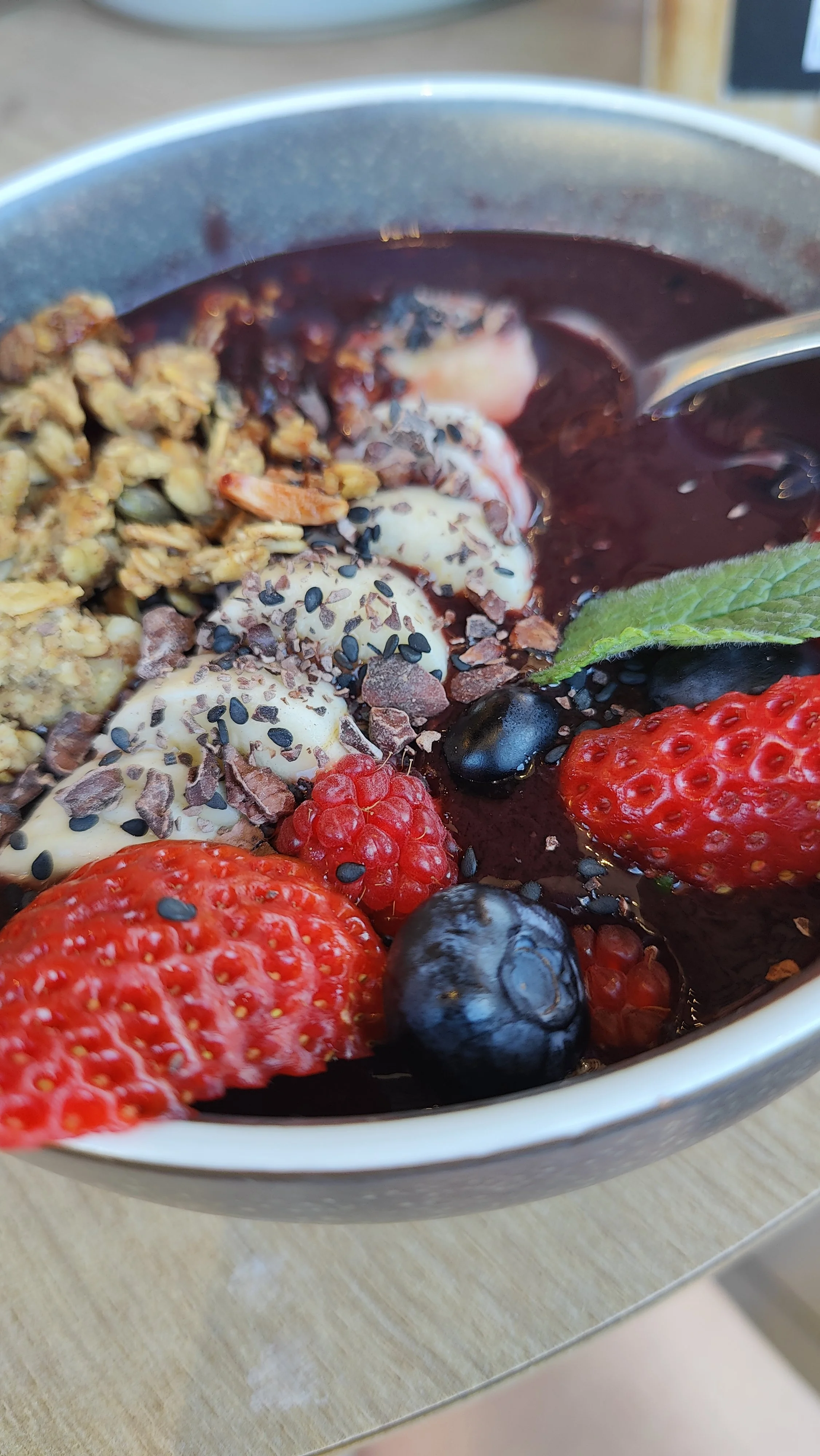 Mens syklene blir reparert, tar vi oss en velfortjent matpause på restauranten jeg kjenner, med den berømte açai-bollen og en kanelsnurr – perfekt for å roe frustrerte damer. Verkstedet bekrefter det vi mistenkte: styret til Ida var noe vi ikke kunne fikse selv, og bremsene mine er endelig slik de skal være.