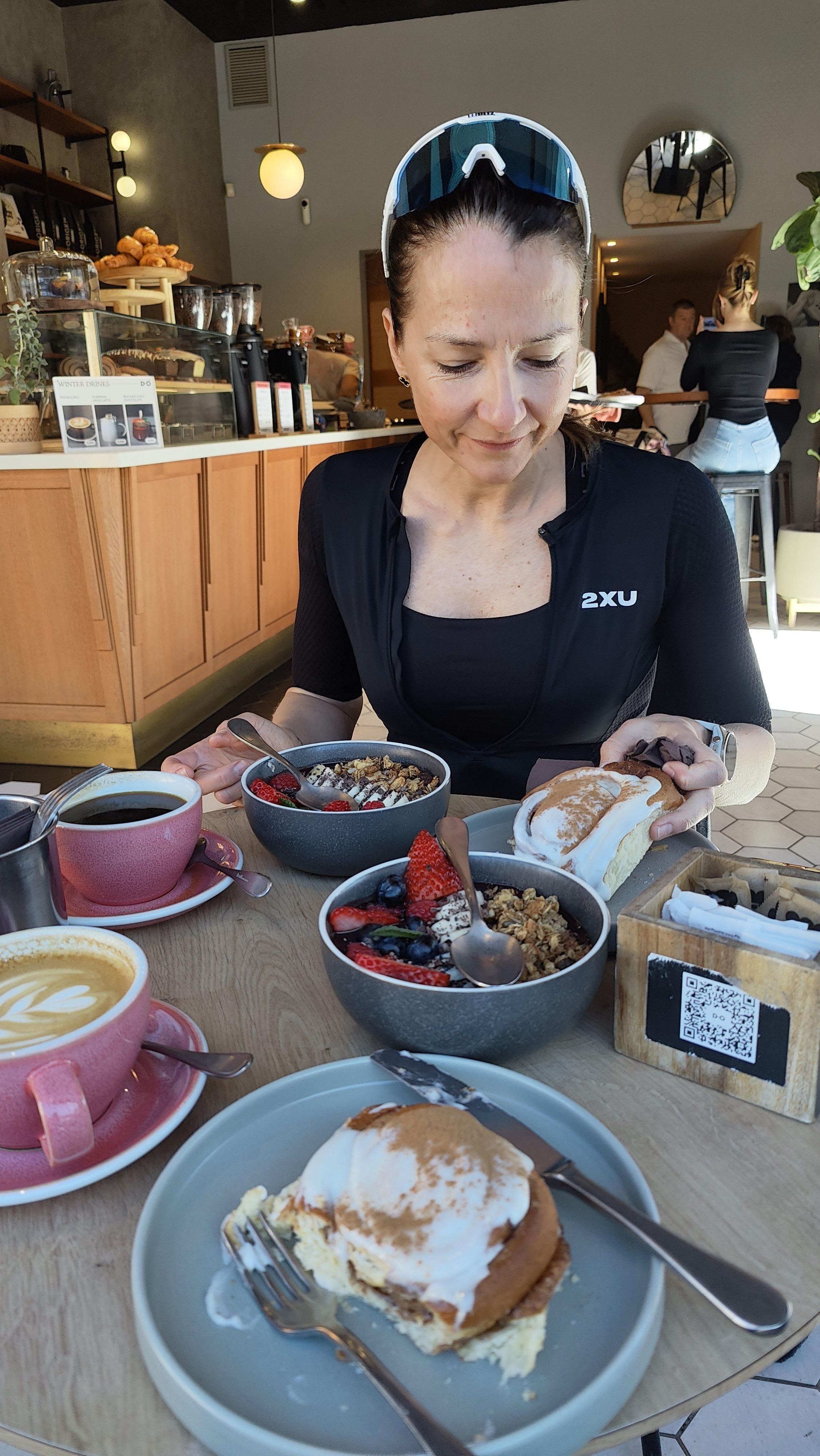 Dette er dagen med mest trening. Vi sykler 160 km, etterfulgt av 16 km løp. Kaffe på senga 05:30, havregrøt kl. 06:00 og avreise kl. 07:30, i kjølig morgenluft. Ida ligger mye i front, stabil og sterk, og vi stopper etter seks mil for å fylle på med karbohydrater – lavt energinivå føltes umiddelbart. Resten av turen går som planlagt, med bølgedaler, topper og riktig påfyll underveis.