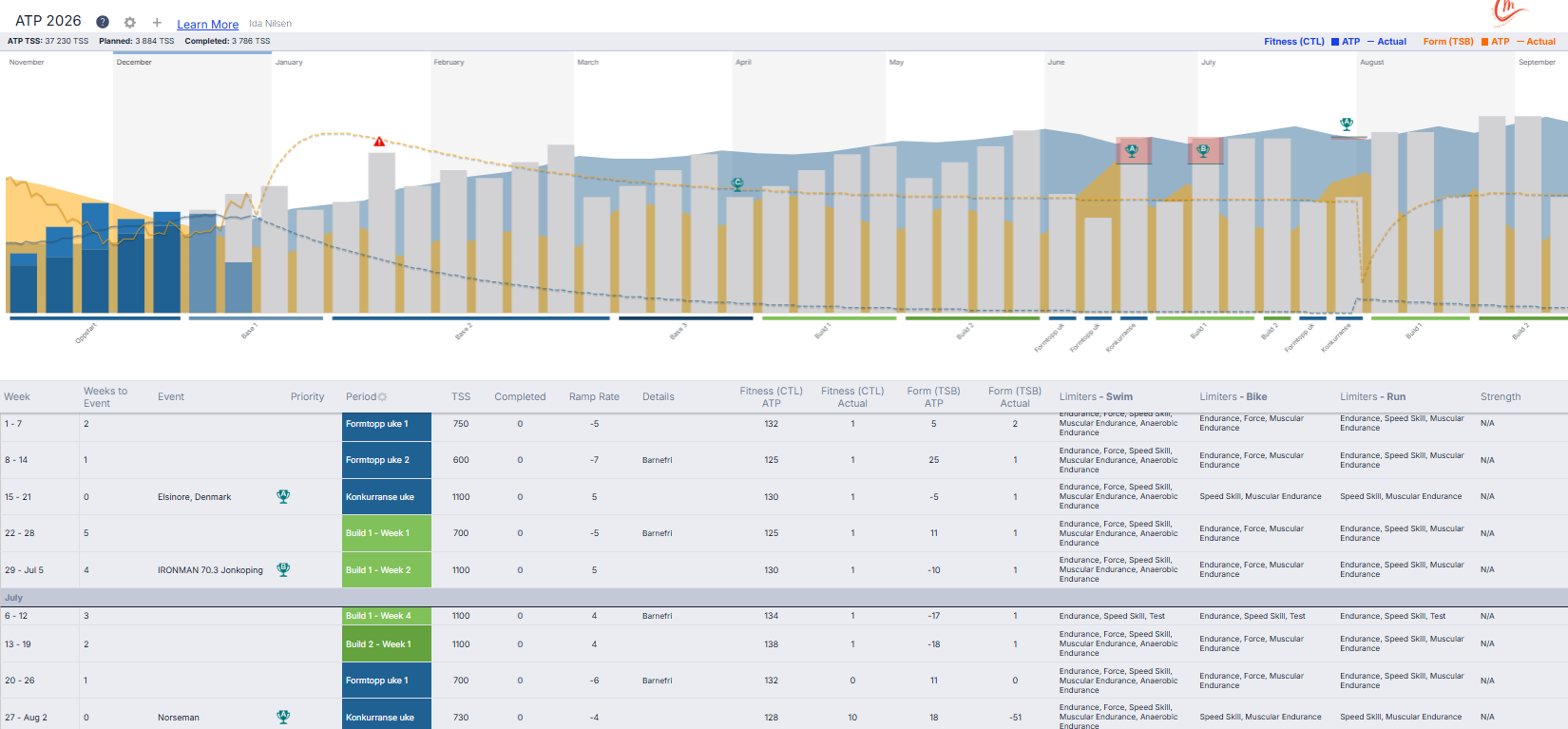 I tillegg planlegges deltakelse på halve Ironman-distanser tidlig i perioden for å bygge erfaring, teste utstyr og trene på konkurransesituasjon i kontrollerte rammer.